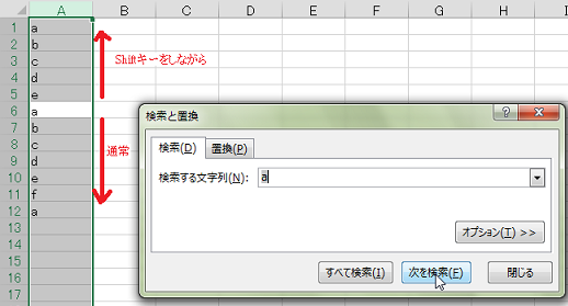 JUGEMテーマ:PC関連 通常検索は、アクティブセル位置から下向きに検索していき、最初に見つかった位置がアクティブになります。 そうではなく、上向きに検索するには次の様にします。 Excel2003の場合:[編集]-[検索]-[検索する文字列]に検索文字を入れ、Shiftキーを押しながら[次を検索]。 Excel2007,Excel2010,Excel2013の場合:[ホーム]-[検索と選択]-[検索]-[検索する文字列]に検索文字を入れ、Shiftキーを押しながら[次を検索]。