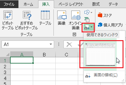 JUGEMテーマ:PC関連 Excel2010以降で可能です。 [挿入]-[スクリーンショット]で、全体を貼り付けたいなら、開いているウィンドウを選ぶか、画面領域を選びます。 画面領域を選んだ場合は、マウスで必要範囲を囲みます。