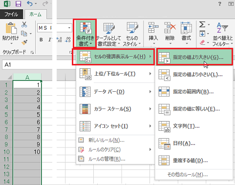 JUGEMテーマ:PC関連 指定の値より大きい場合色を付けるには、条件を設定したいセル範囲を範囲選択した上で次の様にします。 Excel2003の場合:[書式]-[条件付き書式]-[セルの値が][次の値より大きい]を選び、指定の値を入力、書式を設定してOK Excel2007,Excel2010,Excel2013の場合:[ホーム]-[条件付き書式]-[セルの強調表示ルール]-[指定の値より大きい]を選び、指定の値を入力、書式を設定してOK