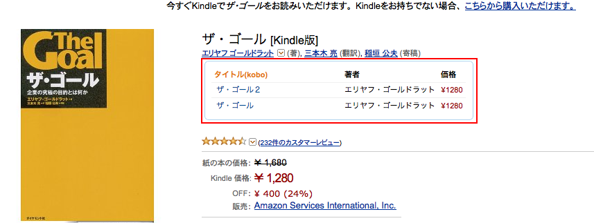 JUGEMテーマ:Amazon Amazonと楽天の連携 Firefox で、Amazonの本の詳細を見たときにKoboでその本があるかわかるAmazonToKoboというスクリプトを作った。 Chrome で同様の機能を使いたい人は「Chromeでも、AmazonでKoboの本があるかチェックできる拡張機能。」を参照してください。 目的 楽天koboは、毎週のように割引クーポンを送ってくる。それを有効に使うためにAmazonで書籍を表示したときに楽天koboでもその本が売られているかを参考に確認できるスクリプトを作った。 サンプル画像 こんな...