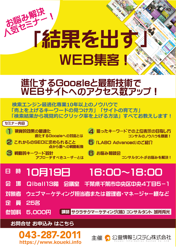 JUGEMテーマ:SEO こんなお悩みありませんか? ・サイトの集客施策の次なる一手に行き詰まりを感じている。 ・SEO分析をする時間が取れない ・ノウハウの蓄積も出来ていない。 ・Google のアルゴリズムのトレンド情報や知識を学びたい。 そんな方へ向けて、最新技術でWEBサイトへのアクセス数を アップさせる方法をお伝えします! 検索エンジン最適化専業を10年以上のノウハウで 「売上を上げるキーワードの見つけ方」 「サイトの育て方」 「検索結果から視覚的にクリック...