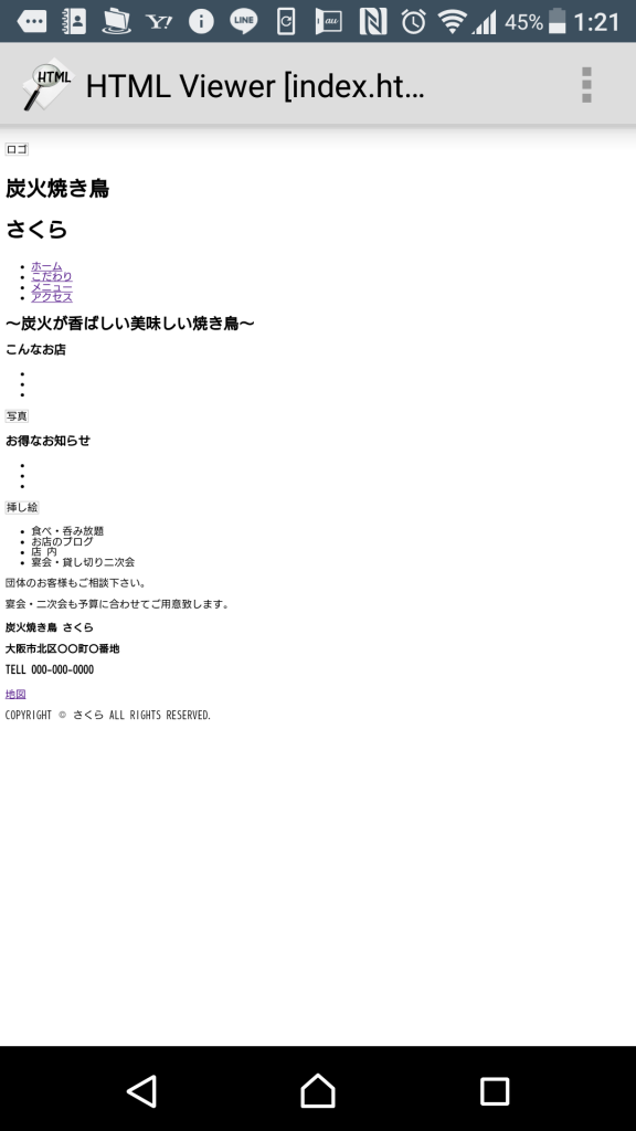 JUGEMテーマ:WEBデザイン:ホームページ制作 ホームページをいよいよ作ろう! いきなりですが、サンプルから。 <!DOCTYPE HTML> <html lang="ja"> <head> <meta http-equiv="X-UA-Compatible" content="IE=edge"> <meta charset="utf-8"> <title>炭火焼き鳥さくら</title> <link rel="stylesheet" href="style.css" type="text/css"> </head> <body>...