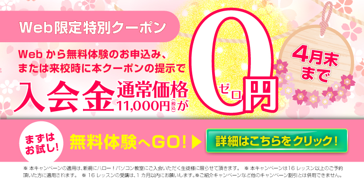JUGEMテーマ:パソコン 神戸市 阪急六甲・JR六甲道駅 徒歩3分の パソコンスクール(スマホ・タブレット講座有) ハロー!パソコン教室 六甲校のブログです ーーーーーーーーーーーーーーーーーーーーーーー みなさん、こんにちは このたび 期間限定ご入会キャンペーンを実施いたします! なんと入会金11,000円が0円で受講できます!(※) ※受講回数が16時間以上のお申し込みの方に限ります 4月末までのお申し込み、限定15名までです! ...