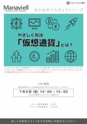 こんにちは ハロー!パソコン教室四条烏丸校の永見です。 今週に入り急に気温が上がりましたね。 京都もいよいよ夏本番といった様子です。 いつもならこの時期祇園祭りの準備がもう始まっていますが、 今年も残念ながら中止です。 来年は開催される事を願い、今年の夏も過ごしましょう。 さて、今回もまたまたオンラインレッスンのご紹介です。 少し前のニュースに上がっていましたが、 仮想通貨が話題になっていましたね。 良く聞くキーワードですが、実際仮想通貨って何?と ...