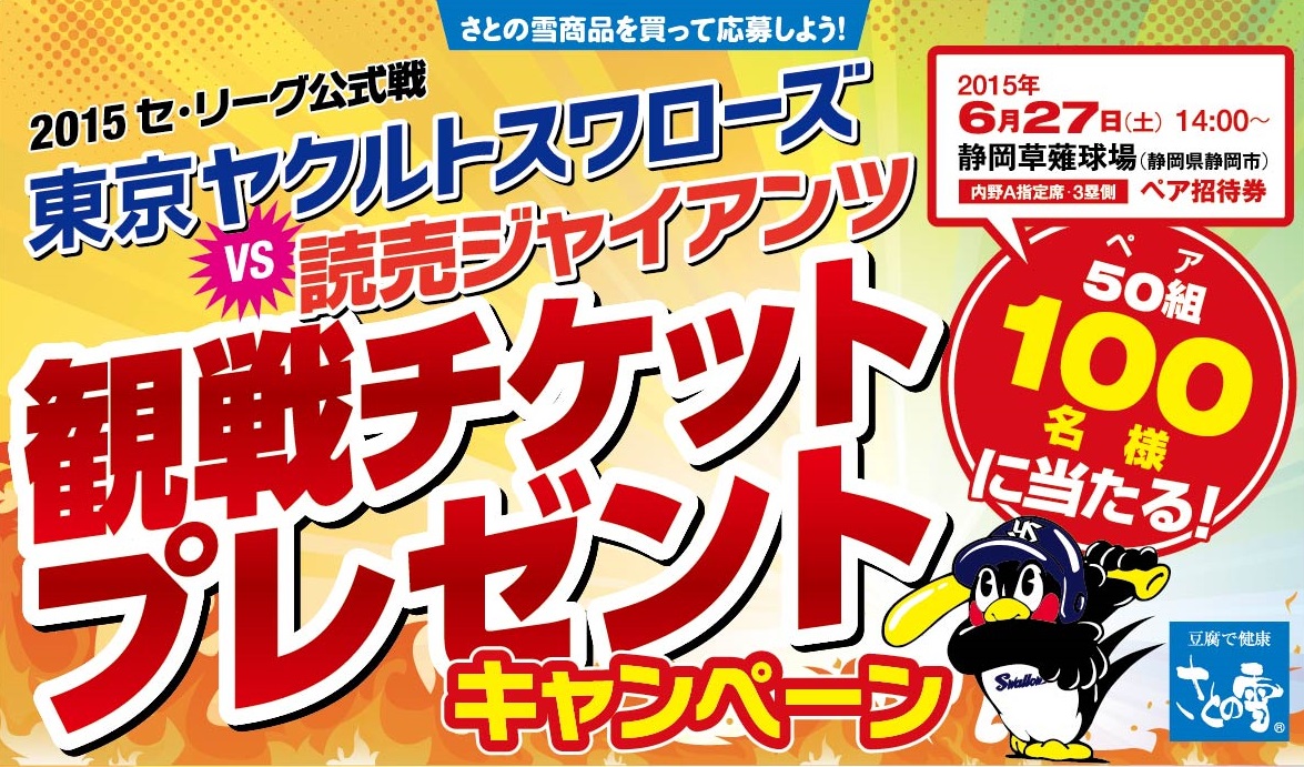JUGEMテーマ:プレゼントキャンペーン・懸賞企画 こんにちは! プロ野球ファンの皆様お待たせしました。 東京ヤクルトスワローズVS読売ジャイアンツの チケットプレゼントキャンペーンを開催いたします。 今年は 静岡県の草薙球場の試合を応援しますよー キャンペーン期間中 「さとの雪」商品のバーコード4枚を応募1口として 専用のはがきまたは市販のはがきに貼付いただき ?郵便番号?住所?氏名?年齢?電話番号をご記入の上ご応募ください。 [あて先] 〒412-0038 静岡県御殿場市駒門1-65-1 さとの雪食品?「...