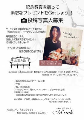 こんにちわ M-rinkです 投稿写真を募集したくて こんなチラシを作りました オムツケーキ・ペーパーケーキをもらった方・・・ ケーキとの記念写真を投稿して下さった方の中から 毎月1名様を選ばせて頂き ささやかなプレゼントを送らせて頂きます 何が届くかは・・・お楽しみです♡ 商品と一緒に、こちらのチラシを同封させて頂きます。 ママになった素敵な記念に是非ご応募ください♡ そして・・・ ご注文頂いた方にも・・・♡ 一緒に記念写真を撮って投稿して頂けた方全員に ...