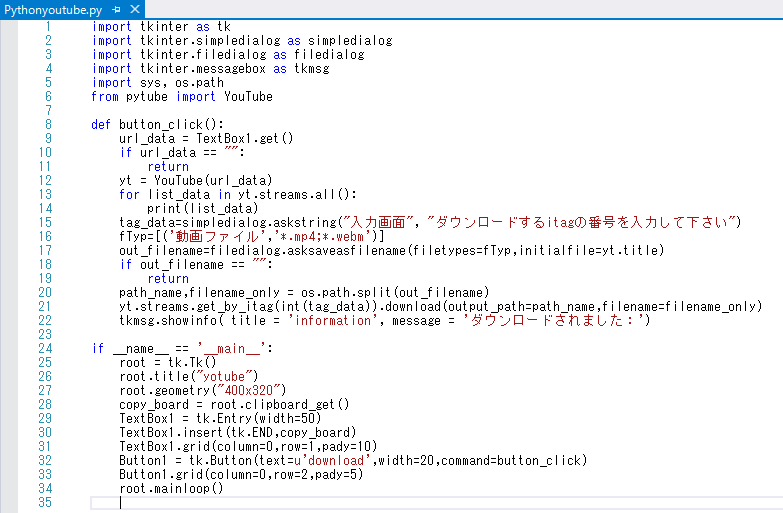 前回からの続きです。 前回のコードをもとにして、簡単なアプリを作ってみます。 簡単なプログラムなので、 いきなり、コードを書いてあとで説明します。 import tkinter as tk import tkinter.simpledialog as simpledialog import tkinter.filedialog as filedialog import tkinter.messagebox as tkmsg import sys, os.path from pytube import YouTube def button_click(): url_data = TextBox1.get() if url_data == "": ...