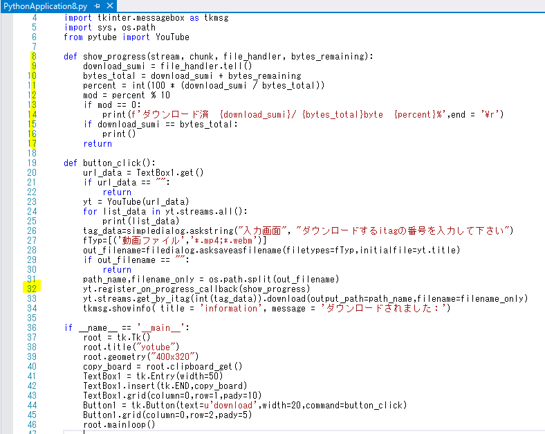 前回から続きです。 最後にダウンロードの状況を表示するコードを入れます。 わかりやすいように、だた単に数字だけで表示しますので、 できる人はグラフィック的にしてみてください。 前回のプログラムのコードに、 yt.register_on_progress_callback(show_progress)を加えます。 これで、ダウンロードしている間(非同期に)show_progressを呼んでくれます。 また、show_progressにパラメータを通知してくれます。 このような機能をコールバックといいます。 ...