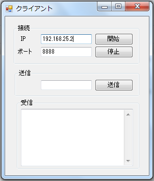 JUGEMテーマ:プログラミング C#言語を使用して、TCP通信のアプリケーションを作成します。 今回は、クライアント側のアプリケーションになります。 TCP通信アプリケーションのダイアログは下記のようになります。 IPには、接続先アドレスを入力して、ポートには、使用するポート番号を入力します。 IP、ポートは自分のPCの環境に合わせてください。 私の場合は、IP「192.168.25.1」、ポート「8888」を入力しました。 また、セキュリティソフトがインストールされている場合は、ネッ...