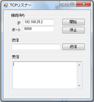 JUGEMテーマ:プログラミング 今回は、リスナー側のTCP通信アプリケーションの作成です。 作成するダイアログは下記のようになります。 あまり、クライアント側のTCP通信アプリケーションと違いはありませんね・・・。 ソースコードは以下の通りです。 ※クライアントからの接続待ち、接続、データの送受信の部分を抜粋です。 private void Btn_Start_Click(object sender, EventArgs e) { if (listener == null) { bStopFlg = false; cli...