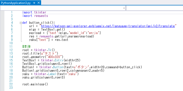 前回の続きです。 前回は、iPadで作っていますが、デスクトップでも、簡単にできます。 こちらは、UIはTkinterを使っています。Tkinterについては、Visual StudioでPythonを使ってみるで説明しています。 基本的には、プログラムの内容は前回と同じです。 import tkinter import requests def button_click(): url = "https://watson-api-explorer.mybluemix.net/language-translator/api/v2/translate" eigo = TextB...