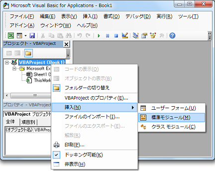 JUGEMテーマ:プログラミング 前回、VBAの開発環境の準備を行いました。 今回は、この開発環境を使用して、VBAのプログラミングを実施してみます。 VBAで行ってみることは、下記の通りになります。 ?Excelのセルの値を読み取る。 ?セルの値に+1する。 ?+1した値をメッセージボックスに表示する。 ?+1した値を別のセルに書き込む。 まずは、モジュールを作成します。 VBAProject(Book1)を右クリックして、メニューを表示します。 メニューから、[挿入]&rarr...