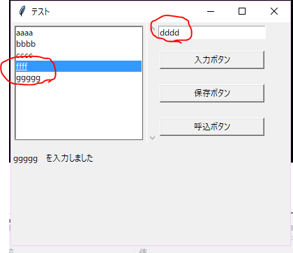 前回からの続きです。 データの挿入と削除を作ってみます。 そうすれば、自動的にデータの修正になります。 挿入: 上の状態で、ffffの上にddddを挿入する場合には、キーボードのShift+Deleteのキーを押します。 削除: また、ffffを削除するときは、キーボードのDeleteキーを押します。 該当部分のコードです。 #項目削除の関数 def Delete_press(event): Label1["text"] ="指定場所を削除しました...