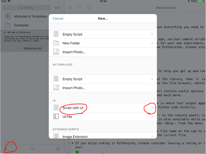 前回からの続きです。 pythonista3は、iOSネイティブ(独自)のUIを簡単に使うことができます。 何はともあれ、まずは、基本のボタンを使ってみましょう。 新規作成(+)から、Script with UIを選びます。 前回、説明したとおり、プログラム名、フォルダを指定してCreateをタップします。 すると、testbutton.pyとtestbutton.pyuiのふたつのプログラムファイルが作成されます。 まずは、そのうちのtestbutton.pyuiを...