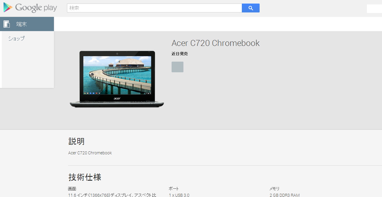 ○スクリーンキャプチャー C720 ○ディスプレイ 135ppi 11.6incで1366x768! ○キーボード。WindowsのCapsLockはサーチキーになります画期的! ○日本版にはSDカードスロットは付かないのかな。キーボードもEnterキーを大きくしたりカスタマイズしてくるはずです。またGoogle日本語入力などGoogleのリッチコンテンツを予めインストールしてコンセプトを隠したまま最高の開発者環境を提供するようです。 追伸3:ページに「Acer C720 Chromebook はお住まいの国ではご利用いただけません。」と明記されました。何かの間...