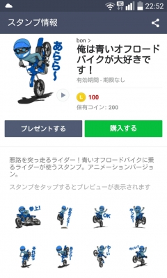 予想外というか、オフ車のスタンプって なぜか人気あるので、感謝の気持ちをこめ、青を追加しました〜♪ オフ車って、人口が多いんかな〜。 http://line.me/S/sticker/1409851 うれしいさっ!ありがとね! JUGEMテーマ:ラインスタンプ