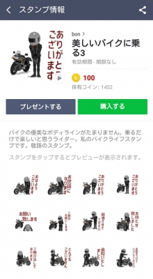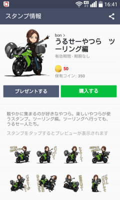 ん〜。 10Rって、わかるよな....。 ま。わからなくても、最新バイクに見えればいいさ! 彼女か奥様に使ってもらって、テンションあげてください。 http://line.me/S/sticker/1243094 がんばっちゃうよ。 JUGEMテーマ:ラインスタンプ