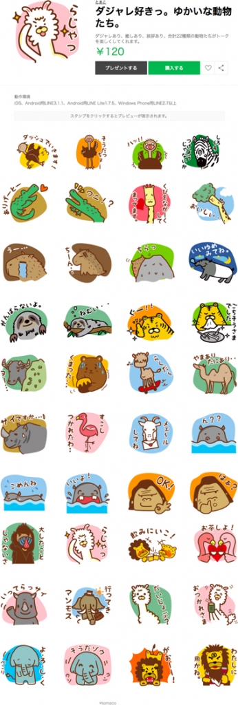 お久しぶりです♪ 2月以来の更新になります。 だいぶ間が開いてしまいました。 前回の記事でお知らせした、ラインスタンプがやっと出来上がりました! 今回は動物シリーズになります! ラインストア、スマホからはラインショップからご購入いただけます。 今回もダジャレを混ぜながら、ゆるい感じで作っております。 良かったら使ってみてくださいね あと、次回改めて記事にしたいと思ってるのですが、 素材サイト、「イラス...
