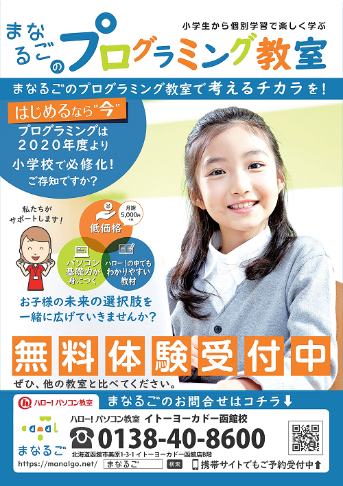 JUGEMテーマ:パソコン教室 JUGEMテーマ:子供のプログラミング こんにちは! 大阪大東市の住道駅から徒歩5分 オペラパーク2Fにあるパソコン教室 ハロー!パソコン教室ポップタウン住道校の山下です。 もうすぐ春、いろいろな事が新しく始まる季節ですね! 春と言えば、学校でもプログラミング学習がいよいよスタートしますね。 当教室では、小学生向けのキッズプログラミング教室 「まなるご」を開講しております。 まなるごでは、「プ...