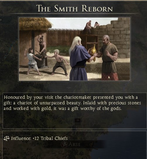 JUGEMテーマ:PCゲーム 第108ターン(紀元前165年春) <お知らせ> ・「名工再び」"The smith reborn"の結果 影響力+12で、大成功ですね! ・滅亡寸前のルシタニが、オリシポをツレデタニから奪還。 ツレデタニとの交易が途絶した、というお知らせが来たので、状況を確認してみるとビックリ。全領土を失って滅亡寸前だったルシタニが、ツレデタニからオリシポの街を奪還していました。がんばるな、ルシタニ。 でも、これはスエビにとって朗報です。これ...