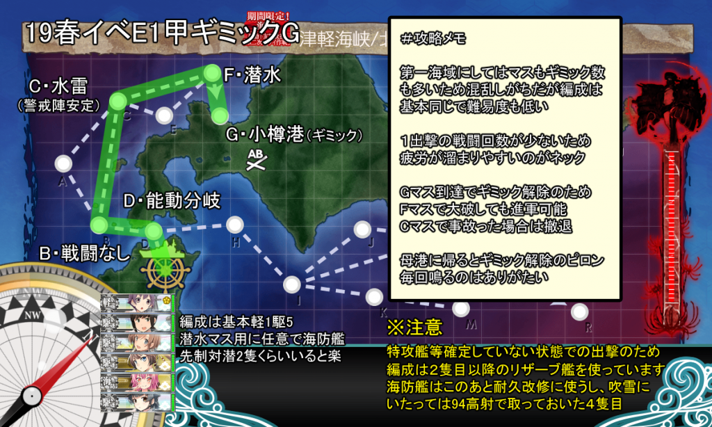JUGEMテーマ:PCゲーム ※注意 特攻艦等かくていしていない状態での出撃のため、編成は2隻目以降のリザーブ艦を使っています。 海防艦はこのあと耐久改修に使うし、吹雪にいたっては94高射装置で取っておいた4隻目です( 基本画像で解説している通り。 軽1駆5の水雷戦隊がベース、先制対潜いると便利。 運営ツイで第百四戦隊と記載があるけど、史実はよくわからない( E3キスカと言ってるので、阿武隈複数いなければE3で使うと思う。 ...