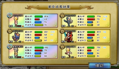 JUGEMテーマ:PCゲーム おこんばんは。フィンです。 フル開花育成結果です。例によって☆6〜10を8回づつ、40戦です。 ボス家臣2体 ?クジンシー(七英雄) ?サルーイン(ロマサガ1ボス) プレミアムチケットでゲットしたチート級奥義の持ち主w、 ?ナイトハルト ガチャで引いた(3体目、1-2体は既に天帝化) ?エレノア うーん。何だろう? エレノア神成...