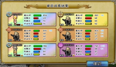 JUGEMテーマ:PCゲーム フィンです。おこんにちはw である・・じゃなくてアデル育成3回目です。 今回は帝アデルだけじゃなくて、戦、戦、帝、王の4体同時育成 今回は☆6〜10を6戦づつ行いました。 育成はクエストの難易度が高ければ良いということはありませんで・・・ 戦を2体含むとこんなもんでしょう。 そんで、結果発表!! 天帝...