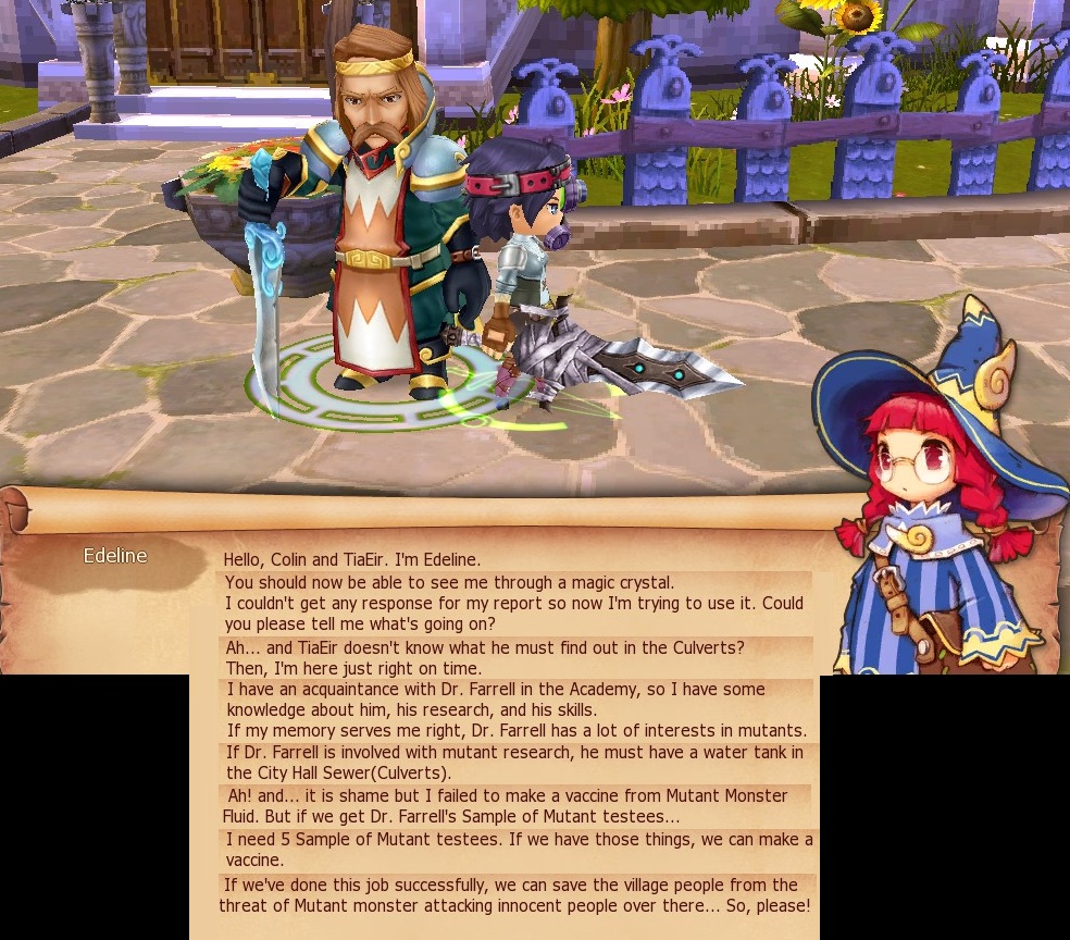 エデリン 「こんにちは、コリンさん、ティアさん。エデリンです。 今、魔法の水晶玉を通じて私を見ることができてるはずです。 私の調査書のことでお返事がないものですから、これを使ってみた次第です。どうされたのか教えていただけますか? あー、それからティアさんは、水路で何を見つけなければならないかを把握していませんね? では、私はちょうどいまここにいますので。(後で来てね、みたいなこと?) 私はアカデミーでDr.パレルと面識がありました。なので彼と彼の研究と彼のスキルについて...