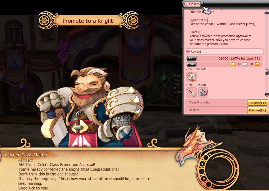 エヴァン 「あは、これはコリン総隊長の転職認可証ではないか!ここで、キミにナイト転職チケットを与えよう! おめでとう!! だがしかしこれで終わったわけではないぞ。これはまだ始まりにすぎぬ。学び続けるために、キミの心がどうあるべきかだ。幸運を祈っとるよ。」 confer:与える This is how your state of mind should be 【直訳で】あなたの心の状態がどうあるべきか in order to keeping learning 学ぶこと(学習)を維持するために ※ゲームを始めて最初から転...