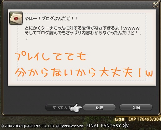 ミハラさん(仮名)に「ブログでキャラ出していいですか?」了解を取るにあたって このブログの存在を明かしました。 ミハラ:「アスカくんてPSO2やってたんだ?私もやろうかと思った時あったんだー」 アスカ:「へー」 ミハラ:「でも、アレ(HDDバースト事件)があったからwww」 で、そのミハラさん(仮名)から、PSO2のストーリー部分について (このブログを読んでの)感想の手紙が来た。 プレイしてて、クーナに愛情もてるヤツはガンジーとかそのくらいのクラスだと思う。 下手したら、そのガンジーすら飛び...