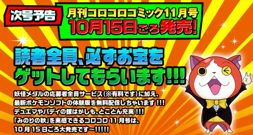 JUGEMテーマ:妖怪ウォッチ 来週コロコロコミック11月号の発売日です。 予約しなくても買えはすると思ってるので、私は予約してませんが・・・。
