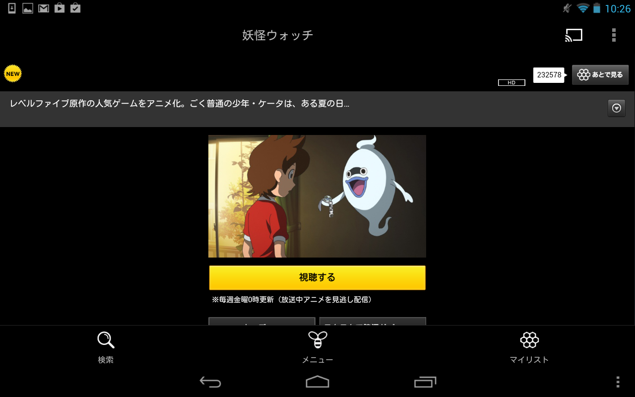 JUGEMテーマ:妖怪ウォッチ 動画配信サイトの dビデオで 妖怪ウォッチのテレビアニメが配信されているんですね! 今日、はじめて知りました。 前から dビデオには加入していたのですが、映画ばかり観ていましたので、 チェックしていませんでした。 最近 chromecastを手に入れたので、さっそくテレビで観ました。 ゲラゲラポー!ゲラゲラポー! dビデオは chromecast対応で画面の大きいテレビで観られるのいいですね。 親御さんと、お子さんが一緒になって観れますし、お子さんの目にも安心です。 hu...