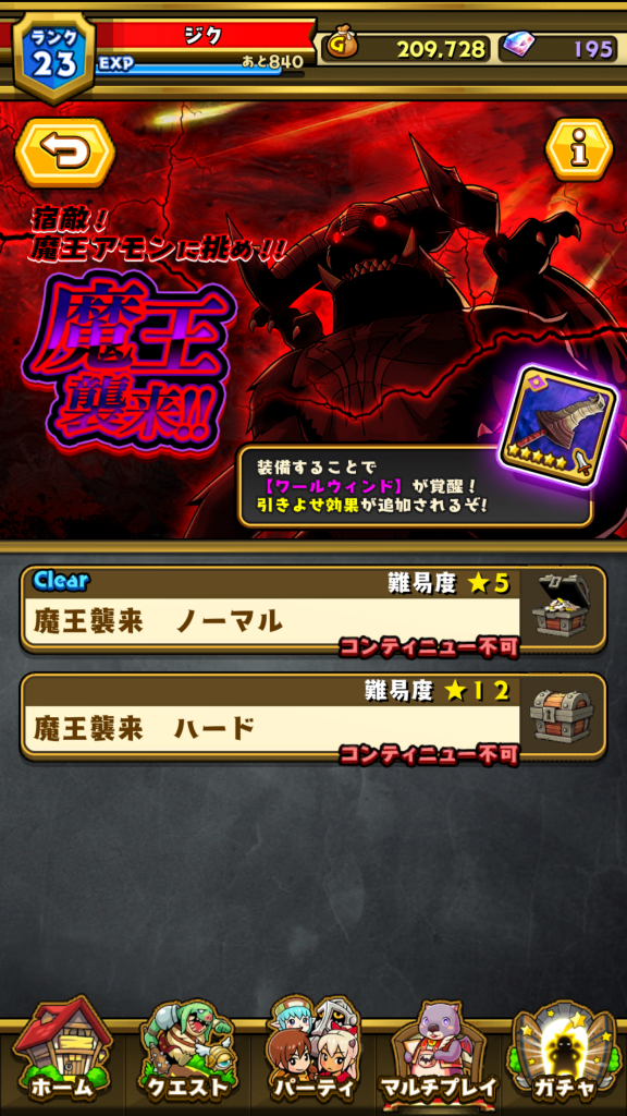 JUGEMテーマ:スマホゲーム マサマサです! 8/15(火)よりマルチクエストに「魔王襲来」が 再配信されました! 今回の配信から難易度ハードには「プレイヤーランク15以上」 の参加制限が追加され「プレイヤーランク15未満」は 参加できないように改善されたようです。 ハードランクも★17から★12まで下がっています。 前回の反省を踏まえたレベル設定になっているみたいですね! これなら良い勝負になるのではないでしょうか? 前...