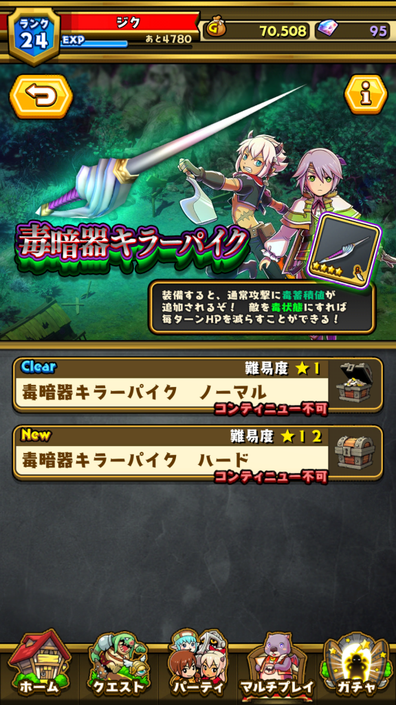 JUGEMテーマ:スマホゲーム マサマサです! 8月18日(金)より新たなクエスト「毒暗器キラーパイク」が登場します。 このイベントでは、敵を毒状態にして毎ターンHPをじわじわと 削っていく「毒暗器キラーパイク」が手に入ります! 盗賊を育てている人はぜひ入手しましょう! 開催期間:2017年8/18(金)15ː00〜8/25(金)14:59 【ドロップ武器】 「キラーパイク」※難易度ノーマルで入手可能 攻撃+30 毒蓄...