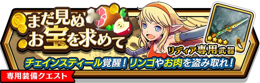 JUGEMテーマ:スマホゲーム マサマサです! 8/23(水)より新たなイベント『まだ見ぬお宝を求めて』が登場します! このイベントでは、リディアの専用武器「宝剣アルビオス」が手に入ります。 マジック「チェインスティール」を覚醒させるアビリティが必ず付き、 覚醒したチェインスティールはゴールドを盗むだけでなく「リンゴ」や「お肉」を ドロップするようになります。 BOSSなどの強敵に備えて「覚醒チェインスティール」でマナやHPを回復させて ピンチを乗りきりましょう(...