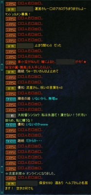昨日の更新忘れちゃったけど、3週目も行ってみよー *+☆+*――*+☆+*――*+☆+* 毎日恒例の「出口」ログが収まらなかった… ので、「例のあの人」が叫んだ。 おさまりませんよね、えぇえぇ。 続けて… 破滅さすな(`ω´)ピャー おめでとう! もう髪の毛は復活しないよ!! …(・ω・`)ドンマイ *+☆+*――*+☆+*――*+☆+* ゆんが100になったので、逆転へ。 前に剣士で行ったときより死にまくりで、迷惑かけまくりで大変でしたorz なんで、こううまくいかないんだろう…(-ω-`) 森羅は作ったけど、やっぱ輪廻の方がいいだろうか...