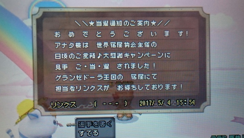5か月ぶりにポストを開けると1通とっても気になるお手紙が!!! うおおおおおおおおおおおお!!^0^!! なにか当たっちゃったみたい^w^♪♪ さっそく行ってみた^w^ わくわくわくわく^w^♪♪ !?!? みなさんもだまされませんでしたかー(;0;)? これクエストだったんですね(;−;) ほんとになんか当たっ...