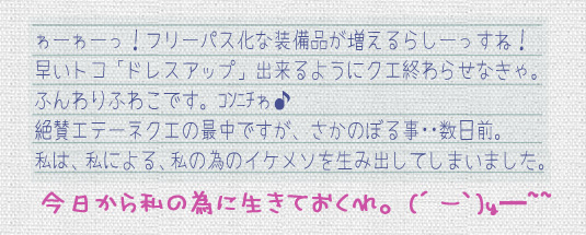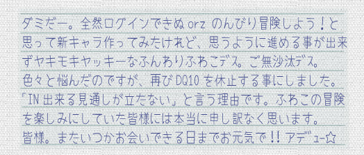 JUGEMテーマ:ドラゴンクエストX プクの日お疲れ様でしたー♪いやはや。。ケシカラン!!ヽ(`Д´)ノ