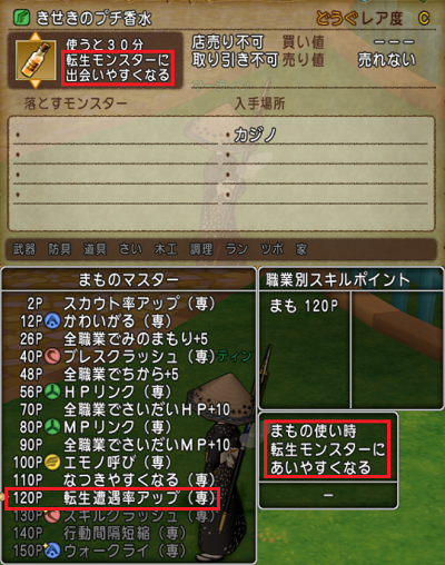 Version3.1で実装された新・転生モンスター2種に会って来ました。 ■転生モンスター狩りの準備 転生モンスターに会いに行く時は「まもの使い」が ・きせきの香水を使う ・「まものマスター」スキルを120まで振る という転生遭遇率アップの手立てをした方が会いやすいです。 「きせきの香水(効果時間1時間)」は娯楽島ラッカランで「プチ香水(効果時間30分)」2個に交換して少しずつ使った方が無駄が無くていいかもしれません。 これはVersion3.1からカジノの「交換屋クラリッサ」さんが「プチ香...