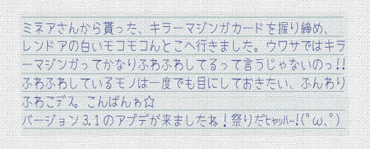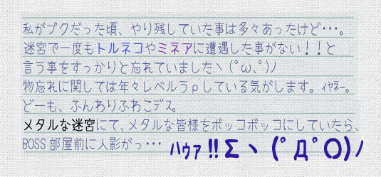 最近、Twitterや様々なブログを見ていると 自分の周りにはそういう話題が無かったので 「本当かなぁ」とどこか他人事に見ていたのだけれど。 「マーティンさん。私、引退決めたんだ。」 「えっ…!」 そのフレチャは突然やって来た。 ■フレの引退宣言 そして 記憶を記録する 彼女は以前、仲の良いフレさんのチームに所属していて、 その縁がきっかけでフレになった。 INしたらいつもあいさつしてくれて気持ちのいいフレさんだった。 「まてまてまてまて...
