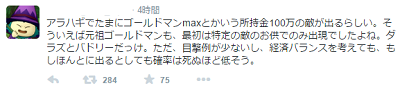 ツイッターを見ておりますと、こんなものが流れてきました。 なに…?! 『ゴールドマンMAX』だ…と… ひ、100万G…!!! ここに「夢」が誕生した 未だ1件しか目撃情報が無いものではあるが100万G夢があるじゃないか! 『ゴールドマンMIN』まで!いや、これはいいか。 早速独り占めしても申し訳無いので(会う前提)、 チムのサブひーちゃんを誘い真アラハギーロの湖へ! ε≡≡ヘ( ´Д`)ノドドドドドドドドドドド...