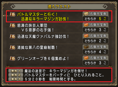 ■サポート仲間のみの場合における5分20秒 8/2配信の達人クエスト 最も高い報酬は「バトルマスターと行く!迅速なキラーマジンガ討伐!」です。 最初これ見た時「5分20秒も掛かってたら逆に戦闘が大変!そんな掛からん!」と思ったのですが、サポート仲間のみで行こうとするなら構成を一応考えて行かないと万一の場合タイムオーバーしてしまいます。 以前「重さ装備のバトでサポのみマジンガ討伐」はやった事があります。 しかしみんながこんな装備持っているわけではありません...