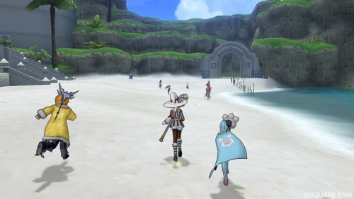 ジュレットの駅から出口に向かって、一斉に走る冒険者のみなさん。 この感じはあれですね、ヒューザを追いかけていた時のあの感じですね!! ということで、放浪の旅をやめたヒューザと入れ替わるように 旅を始めたと噂されるあのひとに会いに、猫島までやってきました。 目的地はぼんやりだけど、先行するみんなに続いていく我々。 まだまだ続いていく我々。 ヒューザのときもそうだったけど、こうやってみんなでドルボードに乗って 走っていると、各種プリズムの見本市のようになりますね。 遠くに棺桶ドルボードのひと...