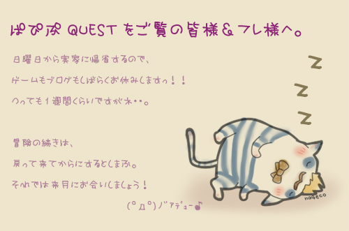 JUGEMテーマ:ドラゴンクエストX よくあるリアルハプニングにより、 職人業→水やりで終わってしまいました。睡眠不足ですが私は元気デス。ヒャッフー♪ 毎度、うちの畑の水やりありがとうございます。ココロより感謝っ(o_ _)o)) Ver3.0の発売日が決まり、ますます面白くなってきたDQ10ですが、 それまでにやらなきゃいけない事がいぱーい。 道に迷わないように、個人的なメモを残しておくます(´Д`) ほら、最近忘れっぽいですからな・・・。 後、大事なの忘れてました。 「白いコ捜索活動!!」これが一...