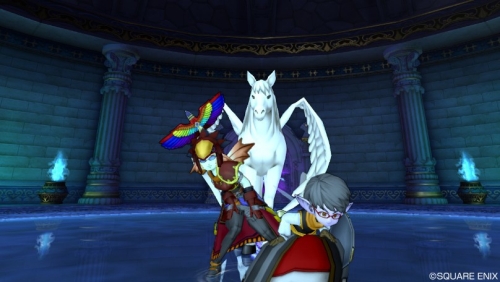 こんにちは、チームペガサスです!! 自分らが乗るのは童顔のドラゴンで、勇者様はペガサスだとか なんかこの世界って結構格差社会ですね!!とか色々思うことのある今日この頃ですが ペガサスのマネー!! とかなんとか、冒険を始めたあの頃のように、最近メインストーリーが 楽しくて楽しみでしょうがない。 と、ペガサスとの触れ合いを散々堪能しました帰り道、上層階から 待機中のペガサスを観察出来ることに気付きました。 ほほう……あれ?なんか今、誰かが通ったような……と見ていると ペガサスの前に見知らぬ冒険者の...