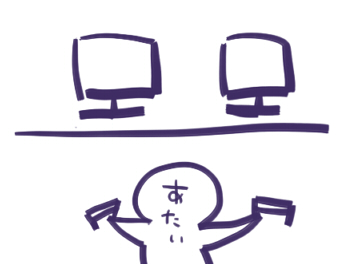 もうやってる人は特に聞くまでもないとは思いますが、 やりたいなと思ってる方(居ないよ)参考になればと、 私のやっている2垢環境を書いておきたいと思います。 ざっくりいうとこんな感じで、PCモニタとTVを横に置いてやってます。 3垢のときはヒザか机に3DSを置きます。 Uパッドと3DSは、ボタンの大きさと距離が違うのと、 画面が小さくて視線移動が大変なので、使うと逆に難易度高いかも。 二垢に既に慣れてる人ならいけちゃうと思いますが…
