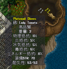 JUGEMテーマ:ウルティマ オンライン 『キノコとトマトのセルフQ&A』 Q1.グローブ系ってガーゴ変成全滅なの? A.きっとそうなんだろうなと半ば諦めつつ試してみたら、 なぜかキルトになりやがりましたよ?