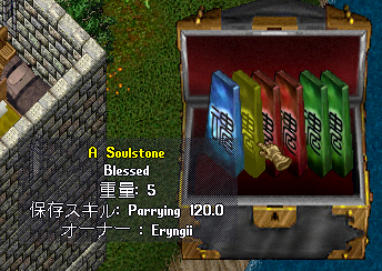 JUGEMテーマ:ウルティマ オンライン ミラーイメージ → 成功するだけのスキル値ではあまり身代わってくれないし準備が必要 2アカで魔曲 → 嫌だ、スキル上げは嫌だ! ていうかそれもうガーゴ関係ねぇ! そんなエリンギの前に、かつて用意したソウルストーンが現れるのです。 もうすっかり忘れていましたが……これで行けるんじゃないかと思いました。