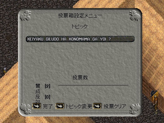 といっても2票だけでしたけど・・・orz この結果を受け、 契約ギルドはこのまま ☆商人連合ギルド☆ とし、引き続き ☆マナ回復+2☆ の恩恵を継続していきたいと思います! 投票してくださった方、どうもありがとうございました! m(__)m