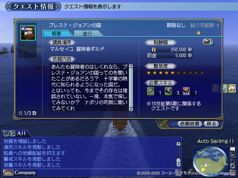 JUGEMテーマ:大航海時代Online 今は昔、私が最初に作ったキャラで遊んでいたころ、このクエストは罠クエとして有名?でした。 一見、ナポリに行くお使い系クエストに見えるこれは、途中からまずい方向へ行きます。 このあと、マッサワへ行って調べてくれと言われるわけです。 「え? マッサワてどこ?」となって、調べると、アフリカ東部、紅海のど真ん中なわけです。 当時はスエズ運河など通っているわけではないので、これは遠大な喜望峰経由のお使いクエと化していました。 つまり「クエストをナポリまでやって...
